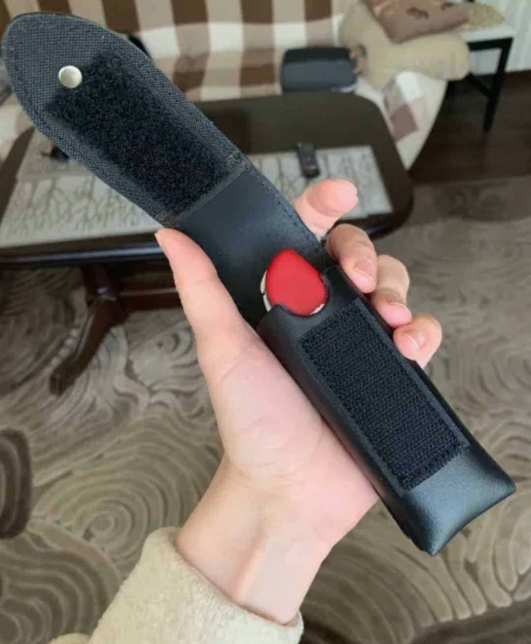 Чехол имеет стильный дизайн. Помогает держать нож в безопасности и под рукой. Очень удобно, можно прицепить к поясу.